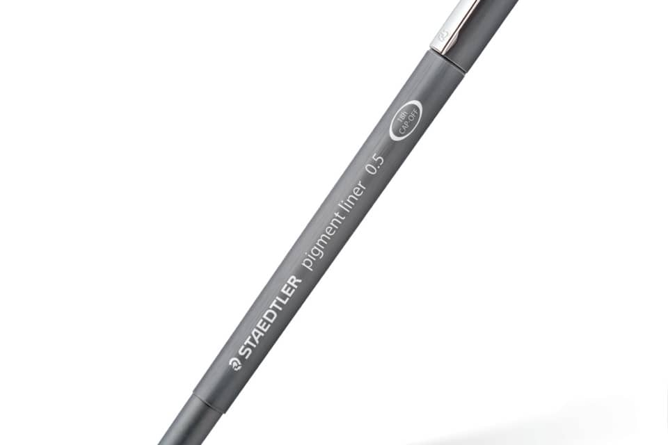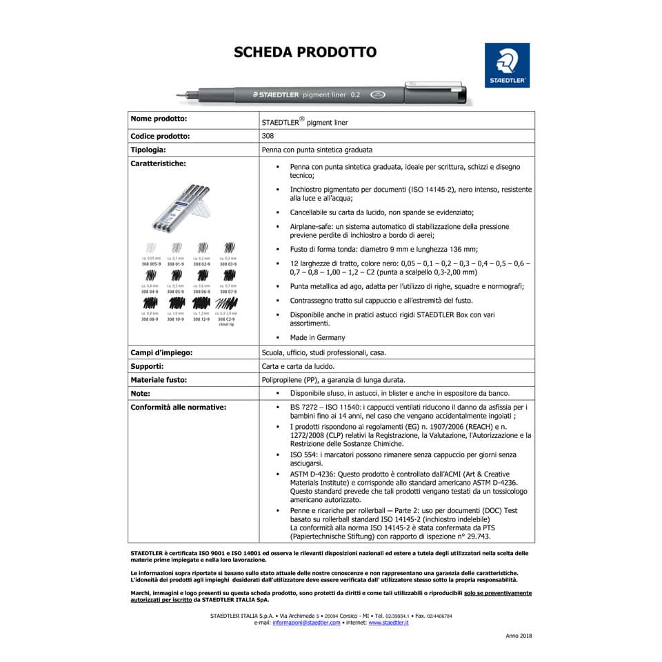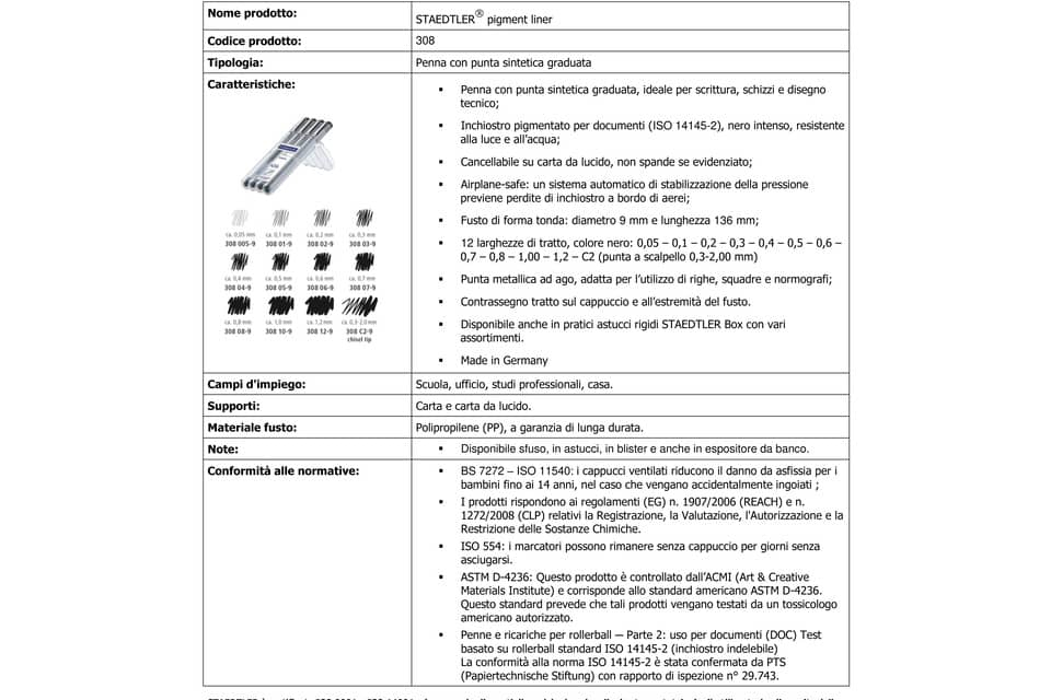 Penna Pigment Liner 308 a punta sintetica graduata 0,8 mm. per scrittura e disegno tecnico, inchiostro pigmentato per documenti; colore nero intenso. Può rimanere senza cappuccio per 18 ore senza sec...