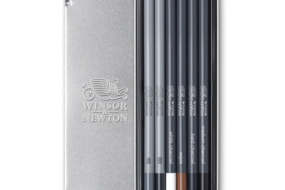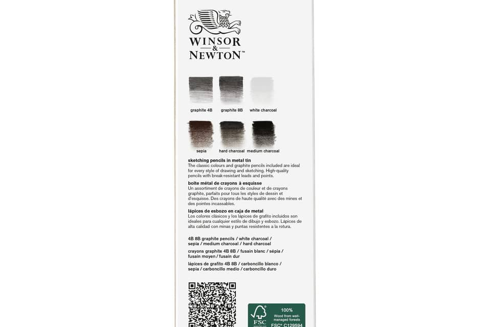 Scatola in metallo composta da 6 matite da schizzo Winsor&Newton così composto: 2 matite di grafite 4B e 8B, 1 matita bianca sfumabile, 1 matita seppia sfumabile, 1 matita carboncino media e 1 matita...