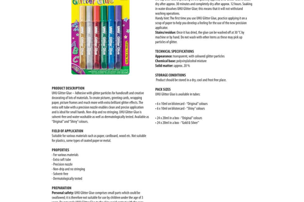 Glitter glue è adatta per moltissimi materiali come carta, cartoncino, vetro, tessuto e legno. Essendo lavabile con acqua tiepida è ideale anche per applicazioni non permanenti. La classica confezio...