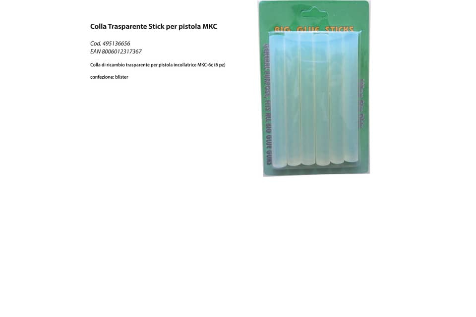 Colla stick trasparente per pistola MKC-6C, 10 grammi per stick. Blister da 6 pezzi. Dimensioni: ø11,2 mm x 100 mm.
