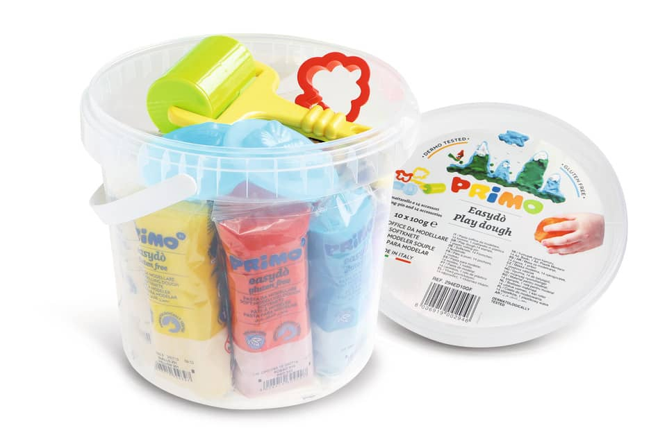 Set di pasta soffice da modellare, panetti da 100 g, in secchiello da: 10 colori, 6 formine, 8 stampini, 1 mattarello in plastica. Easydò gluten free è una pasta da modellare colorata e senza glutin...