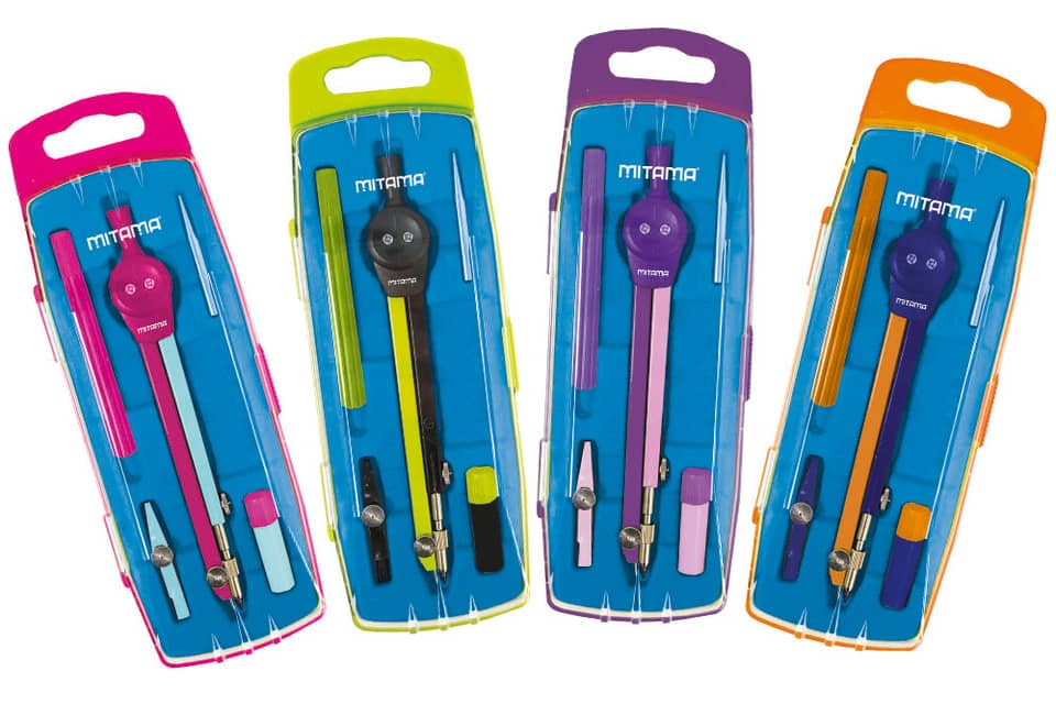 Compasso con asta articolata, meccanismo a grimagliera, asta e ago snodabili, innesto a punta, impugnatura per tiralinee per china, puntale, vite e mina di ricambio incluse. Colori Fluo a contrasto, f...