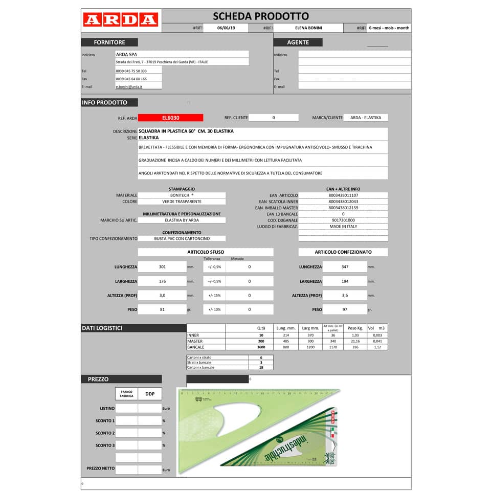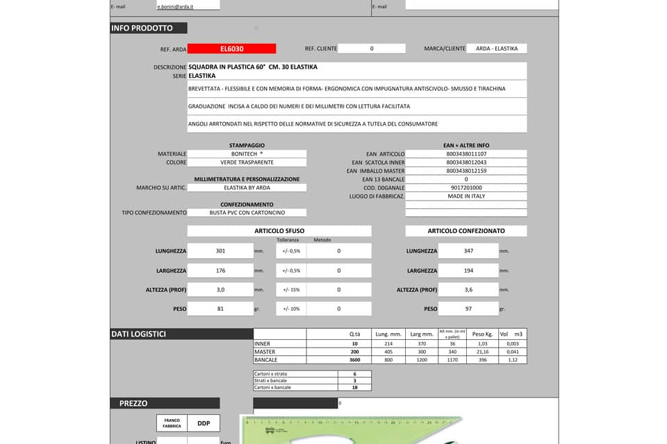 Flessibile e con memoria di forma. Ergonomica con impugnatura antiscivolo, smusso e tirachina. Graduazione incisa a caldo dei numeri e dei millimetri con lettura facilitata. Angoli arrotondati nel ris...