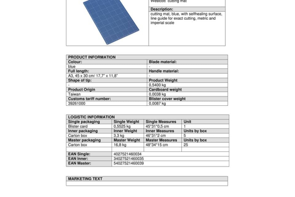 La stuoia da taglio di WESTCOTT® è dotata di una superficie rigenerativa, vale a dire che la linea di taglio si richiude e diventa invisibile. I nucleo della stuoia è resistente al taglio. Inoltre ...