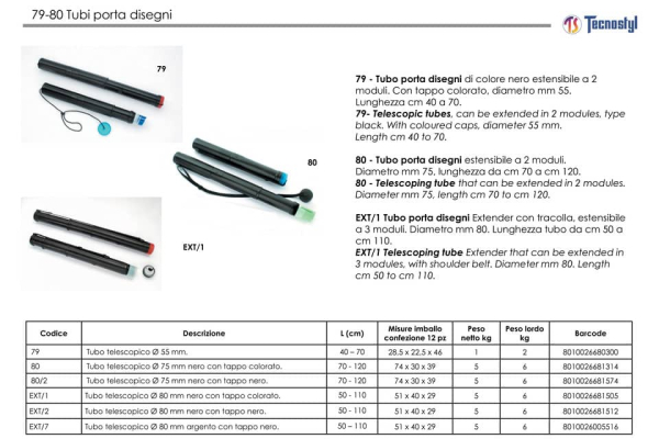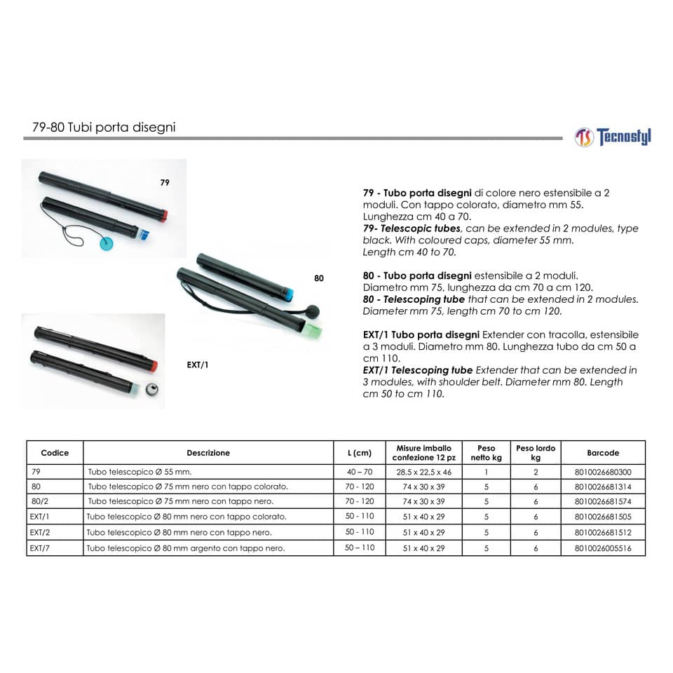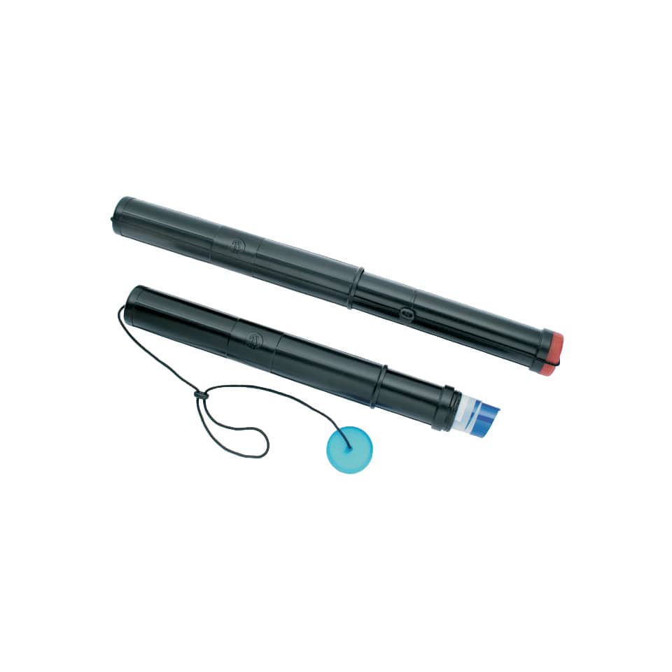 Tubo porta disegni di colore nero estensibile a 2 moduli. Con tappo colorato, diametro mm 55. Lunghezza cm 40 a 70.