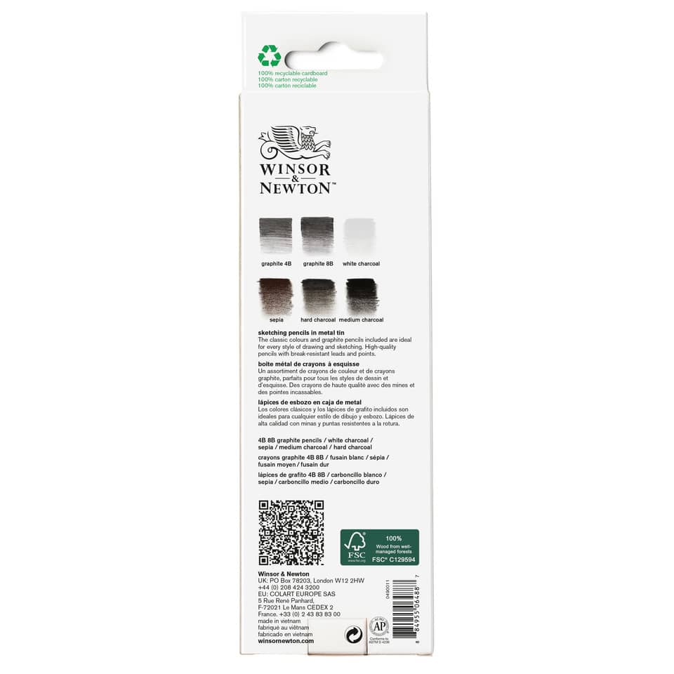 Scatola in metallo composta da 6 matite da schizzo Winsor&Newton così composto: 2 matite di grafite 4B e 8B, 1 matita bianca sfumabile, 1 matita seppia sfumabile, 1 matita carboncino media e 1 matita...