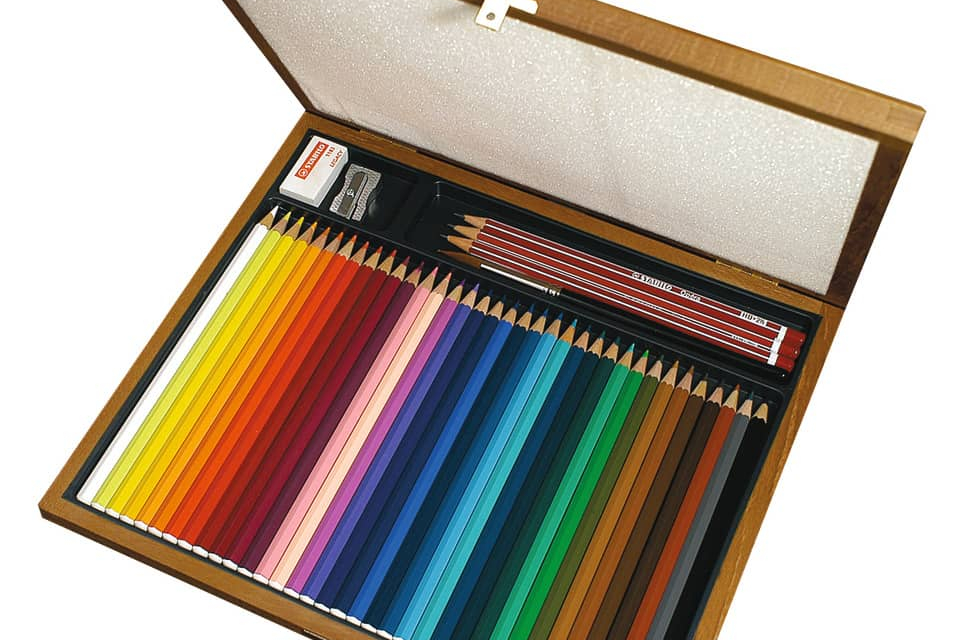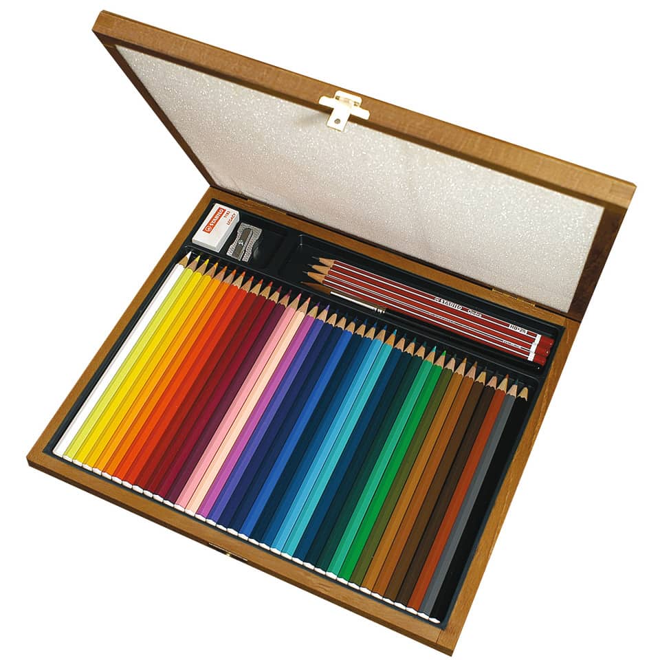 Cassetta in legno con ripiano interno in plastica contenente 36 matite acquerellabili Acquacolor. Chiusura con clip in metallo, interno con gommapiuma per proteggere le matite da urti e cadute. La cas...