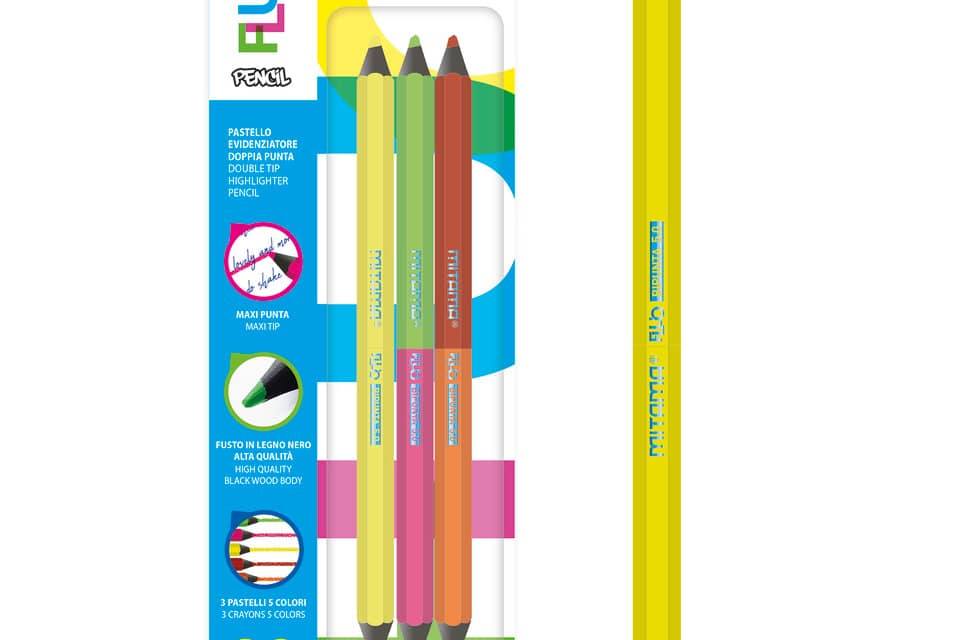 Pastello Evidenzitore fluo e bipunta, con maxi punta da 5.0 mm, resistente agli urti e in legno nero di alta qualità. Confezione composta da 3 pezzi.