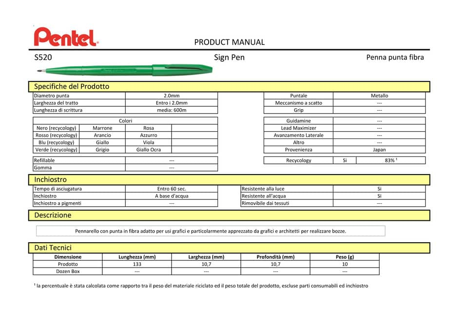 Pennarello con punta in fibra particolarmente adatto per usi grafici. Apprezzato da grafici e architetti per realizzare bozze. Lunghezza di scrittura media 900m. Prodotto con l'83% di materiale ricicl...