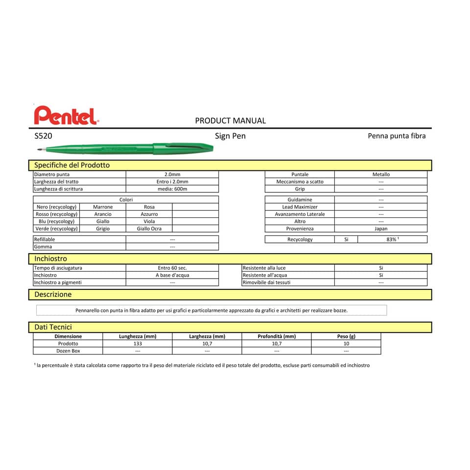 Pennarello con punta in fibra particolarmente adatto per usi grafici. Apprezzato da grafici e architetti per realizzare bozze. Lunghezza di scrittura media 900m. Prodotto con l'83% di materiale ricicl...