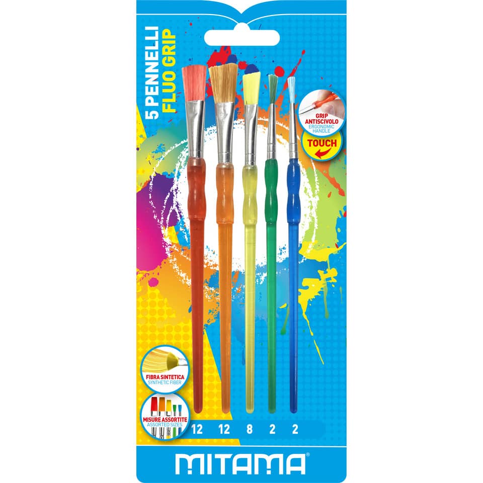 Pennelli colori fluo con grip antiscivolo, confezione composta da 3 pennelli piatti e 2 pennelli tondi. 2 pennelli misura 12, 1 pennello misura 8 e 2 pennelli misura 2. Colori assortiti. In fibra sint...