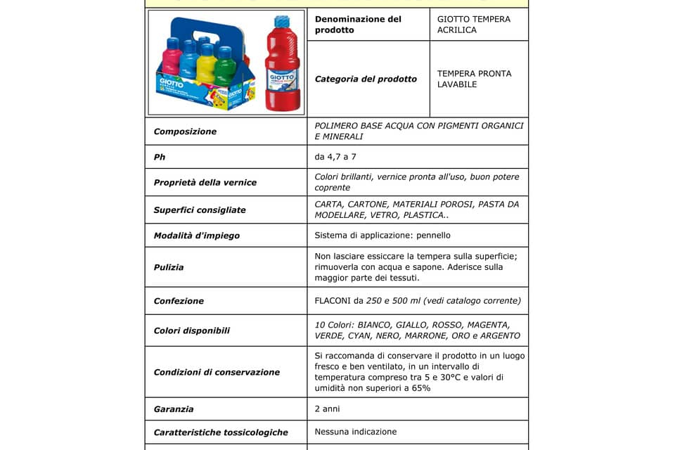 Tempera Giotto Acrilica 500 ml. Appositamente studiate e realizzate per i bambini e quindi innocue e ideali per qualsiasi applicazione. Formulate con una speciale resina che conferisce buona applicabi...