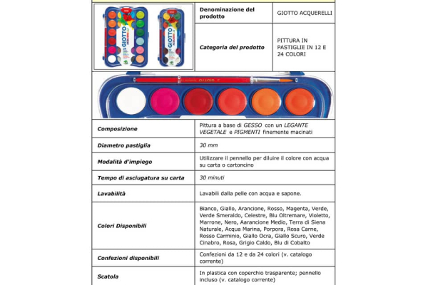 Acquerelli in pastiglie Giotto 30mm. Nuovo design più funzionale che ne facilita l'uso. Colori più luminosi, intensi e coprenti grazie alla nuova formulazione. La pittura può essere diluita con acq...