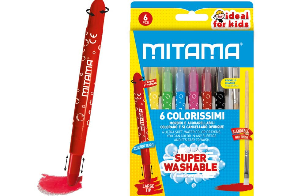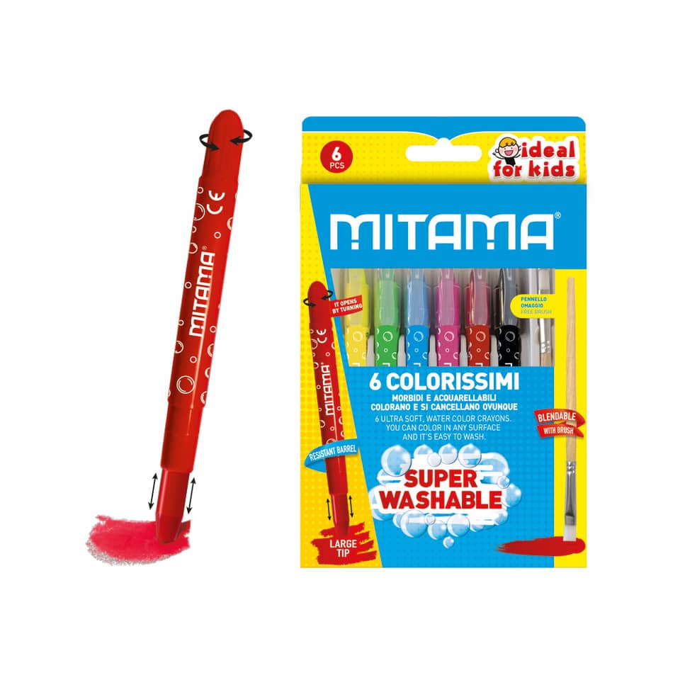 Mega colori ultra morbidi con tratto super coprente, sfumabili con le dita, acquerellabili con pennello (incluso) e SUPERLAVABILI da ogni superficie. Punta allungabile con apertura TWIST che permette ...