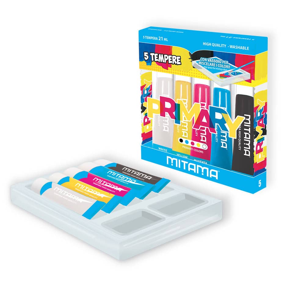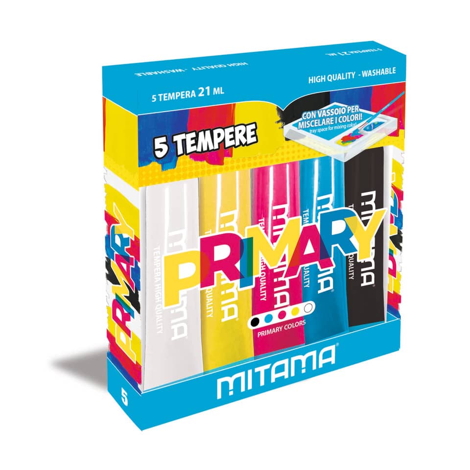 Colori a tempera lavabili di alta qualità: più coprenti, più corposi, più scorrevoli. La confezione contiene 5 colori primari da 21 ml, 2 pennelli ed 1 guida per creare tutte le combinazioni di co...