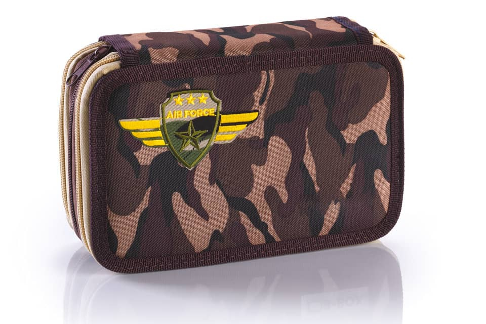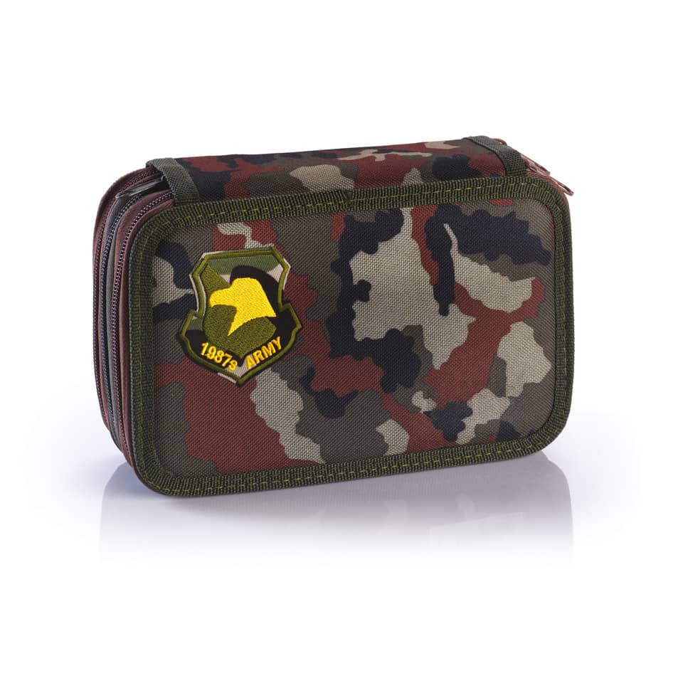 Astuccio a 3 zip. Riempimento: 12 pastelli Fila Giotto laccato, 18 pennarelli Fila Giotto turbo Color, 1 evidenziatore Fila Giotto turbo, 2 penne Fila Tratto Uno, 1 matita Lyra Studium , 1 temperino, ...