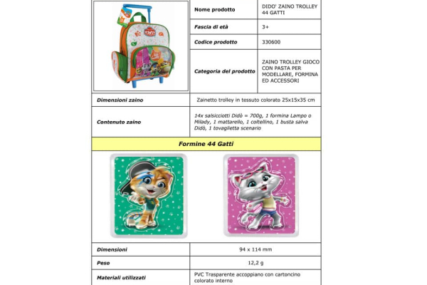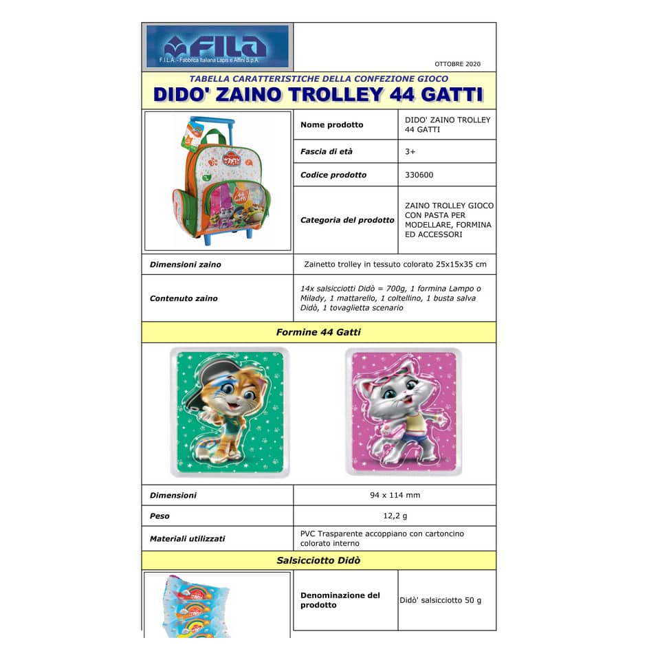 Una licenza gattastica! I 44 gatti sono lo show più seguito su Rai Yo Yo in target con il consumatore Didò. Lo zaino-trolley contiene 14x salsicciotti Didò da 700g, 1 formina Lampo o Milady, 1 mat...